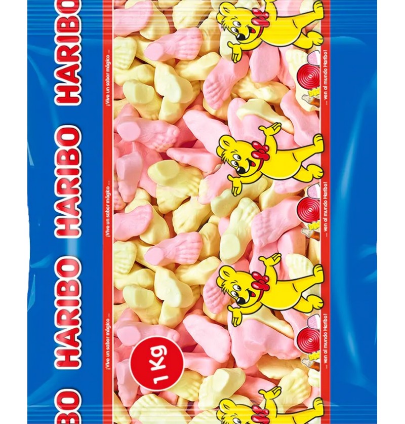 Chuche en forma de pie, a dos colores y con sabor a yogurt de fresa y plátano. Disponible también a granel.